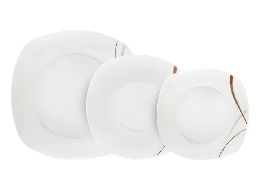 Porcellana,set 18pezzi composto da 6piani 6fondi 6frutta dimensioni piatto piano  profondità cm25,altezza cm3,larghezza cm25 dimensioni piatto frutta profondità cm19,altezza cm2,larghezza cm19 dimensioni piatto fondo profondità cm 22,altezza cm4,5,larghezza cm22,capacità ml350 oppure 36Pz