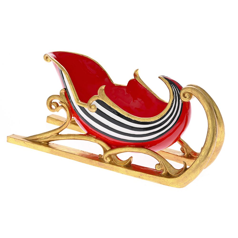 The sled is made of resin, a lightweight and durable material, and is designed with an elegant combination of colors and patterns. The predominant color is red gold, which gives a festive and luxurious look to the piece. There are black and white lines on the surface of the sled, which help to create an attractive and contrasting design.