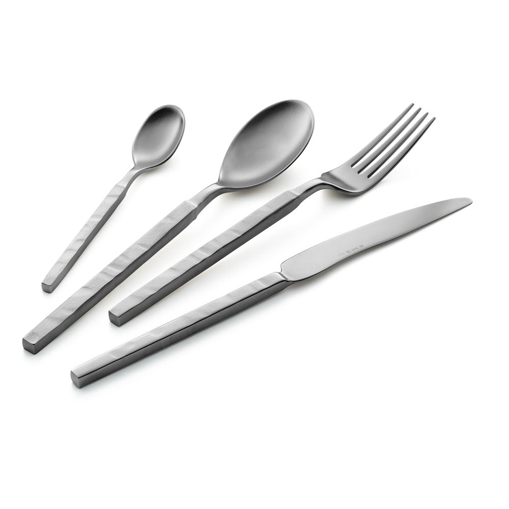 Zeus Ice is a forged cutlery whose hammered handle evokes the ancient ritual of manual workmanship of the blacksmiths who, in their forges, shaped the incandescent brand with hammer blows until they obtained, with their mastery, unique artefacts. The wavy and irregular surfaces of the handle recall the incessant beating of hammers. As well as the knife blades with a discontinuous profile and unmistakable silhouette. Square design and functional attention distinguish this collection of sandblasted cutlery inspired by modern urban spaces.