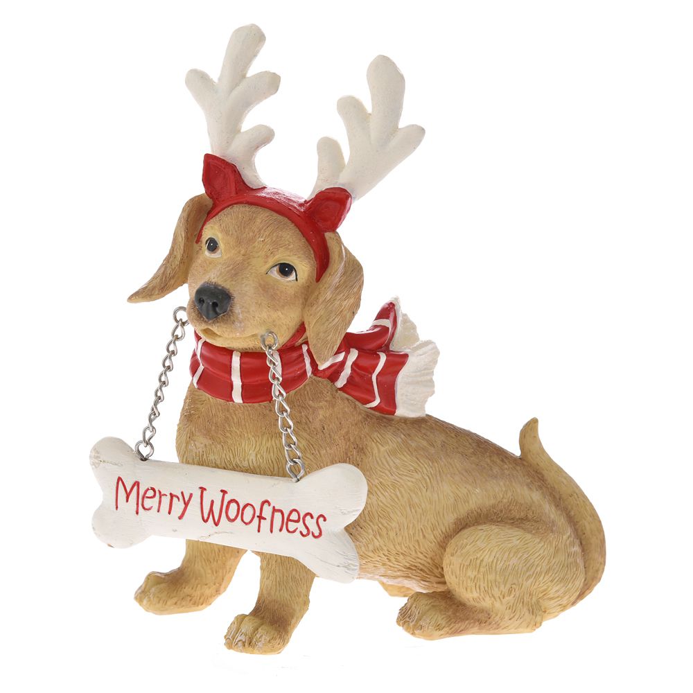 CANE NATALIZIO IN POLIRESINA CON OSSO MERRY CHRISTMAS 18X9X20CM